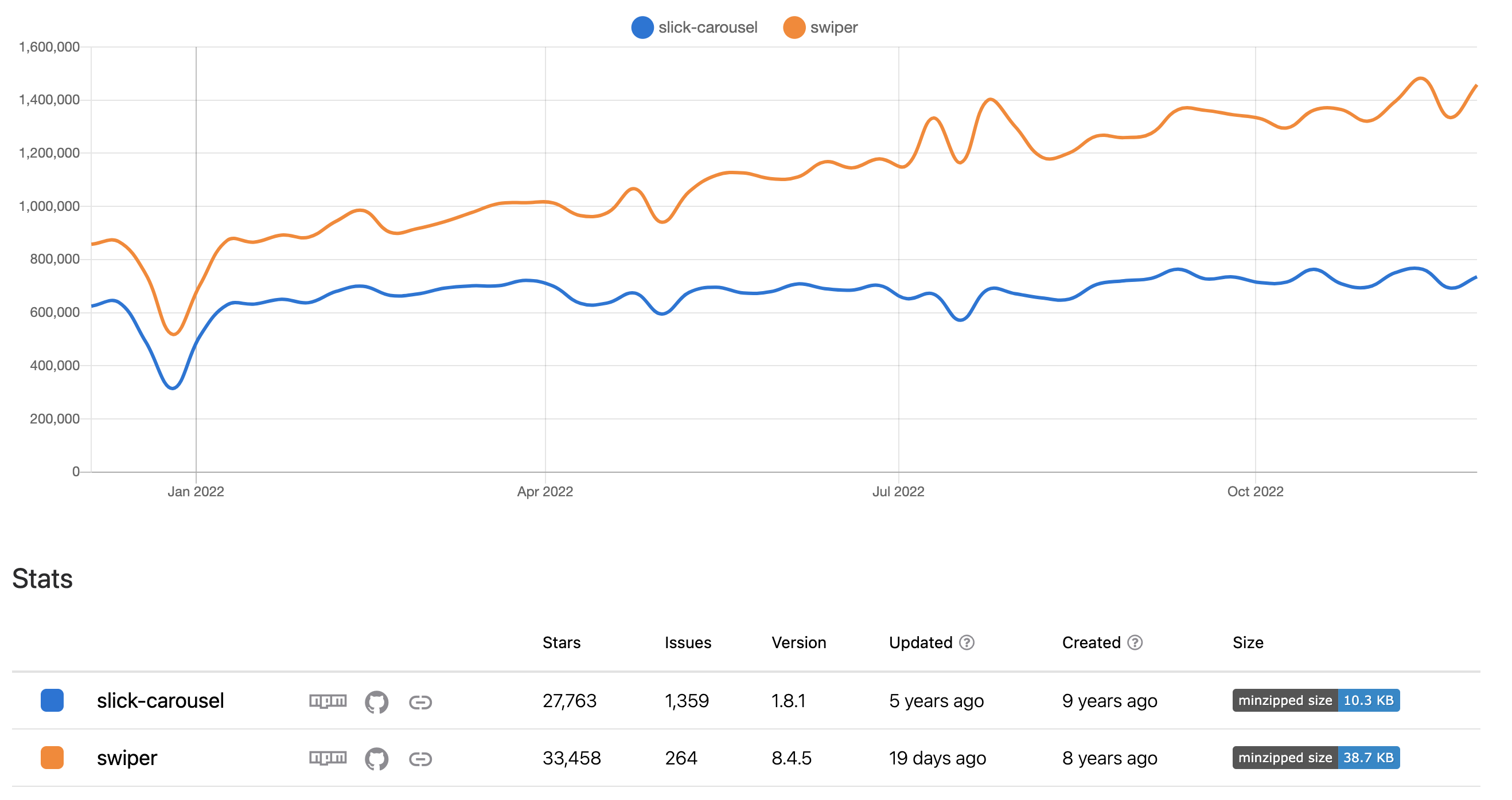 npm trends에서도 최근 1년 사용성도 더 많고 업데이트도 빠르며 데모(Demo)가 잘 나와있는 Swiper라는 라이브러리르 사용하게 되었습니다.