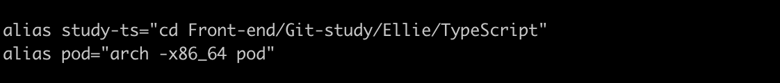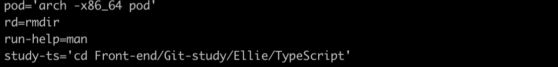Example 에 나온 예시처럼 단축어="실행할 명령어" 형식으로 지정해주면 되는데요. 이때 = 양쪽으로 띄어쓰기가 되지 않게 주의해 주세요. 저는 추가적으로 pod 뿐만 아니라 자주 접근하는 파일 경로도 alias로 지정해 주었습니다.