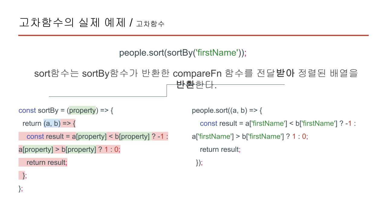 다시 추상화시킨 sort구절을 보면 sort함수는 sortBy함수가 반환한 compareFn 함수를 받아 정렬된 배열을 반환해 줍니다. sortBy함수는 인자를 취하고 활용해서 다른 함수를 반환한 것입니다.