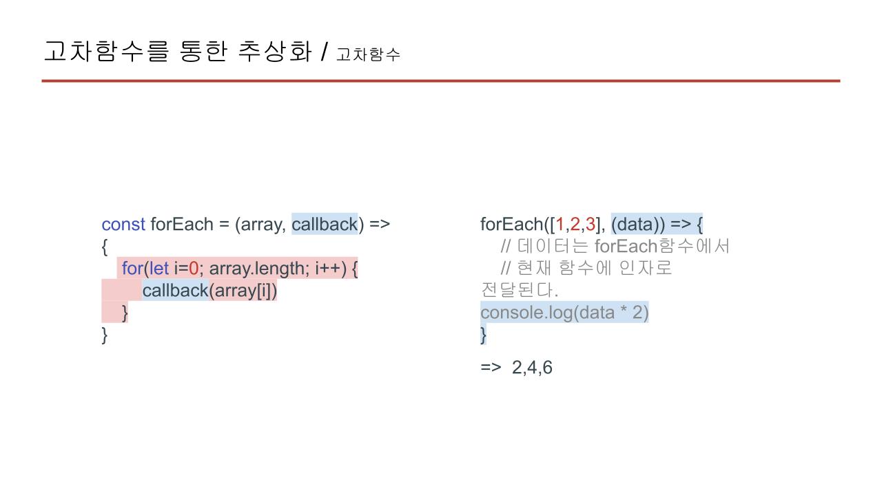 우리가 자주 사용하는 forEach의 내부로직이 왼쪽과 같이 구현되어있다고 봅시다. forEach에서 는 callback함수를 받으니 고차함수에 해당되며 다만, 전달될 함수를 실행만 하고 반환하지는 않습니다.