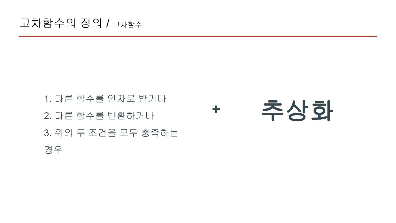 고차함수란 1. 다른 함수를 인자로 받거나 2. 다른 함수를 반환하거나 3. 위의 두 조건을 모두 충족하는 경우를 말합니다. 또한 개발을 하면 항상 고민하게 되는 단어인 추상화는 고차함수와도 깊게 관련되어 있습니다.