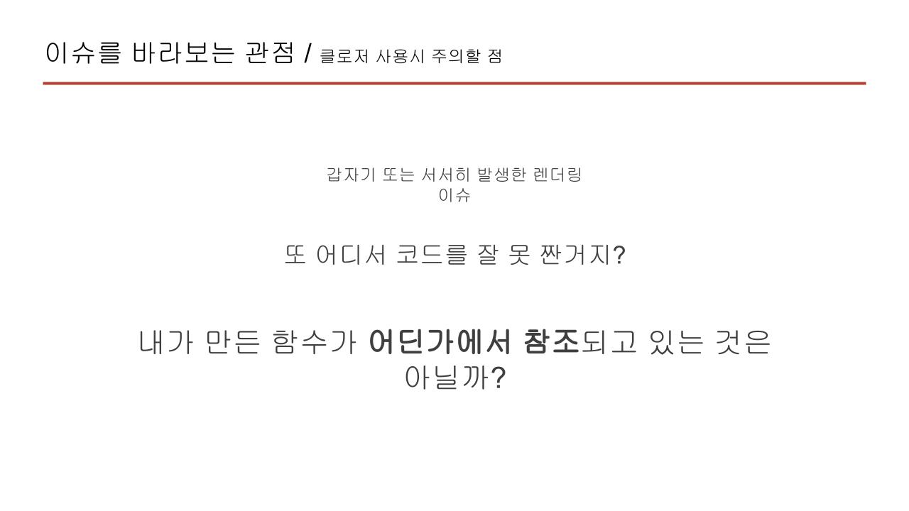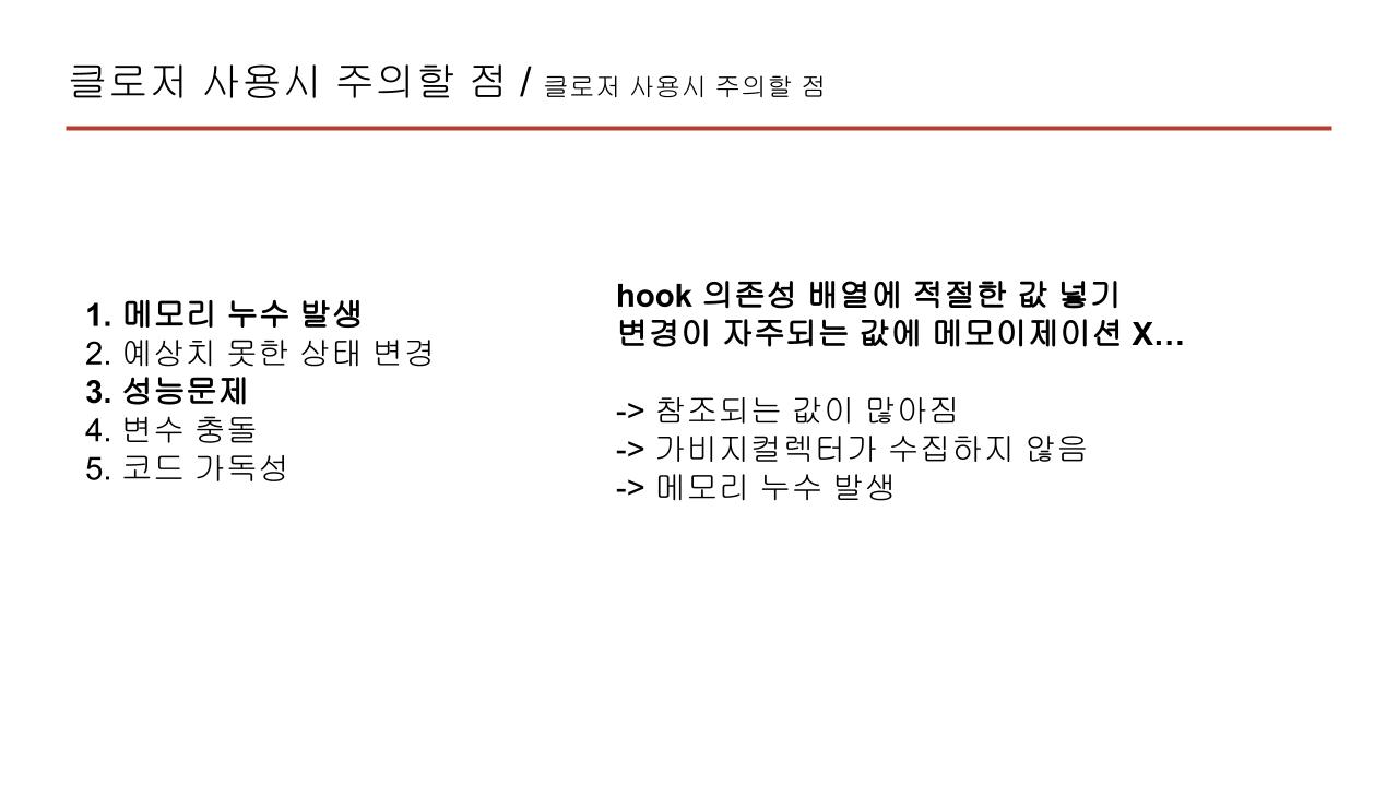 대표적인 클로저 사용의 주의점입니다. 메모리 누수발생, 바깥 변수의 오남용으로 예상치 못한 상태 변경, 성능고려, 변수 충돌, 코드 가독성이 있네요. 아마 여러분들은 이미 이런 주의점을 클로저를 잘 이해한 상태가 아니더라도 주의하며 설계를 하시고 계실 것 같습니다. 여기서 메모리 누수 발생과 성능문제는 왜 발생할 수 있을까요? 이는 함수형 컴포넌트는 렌더링시 재호출하며 클로저가 사용된 함수가 있다면 각각의 참조를 만들어 가비지 컬렉터에 수집되지 않을 수 있기 때문입니다. 그래서 hook에서 dependency array에 적절한 값을 넣기, 변경이 자주 되는 값에 메모 씌우기 등은 클로저의 이점을 누리기 전에 성능 저하를 겪을 수 있습니다.