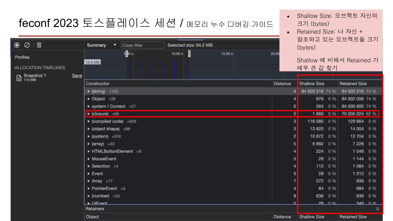 누수가 되는 지점을 찾기 위해서는 좀 더 자세한 디버깅이 필요합니다. Shallow Size에 비해서 Retained가 매우 큰 값이 있다면 누수의 범인일 확률이 커집니다. 데이터 참조 지점을 파악하기 위해 클로저를 펼쳐보고, 누수가 발생하는 함수를 찾아봅니다.