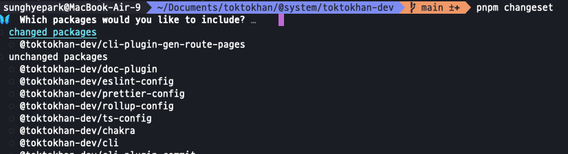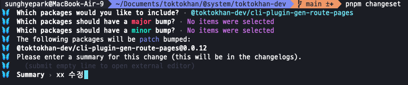 터미널에서 pnpm changeset 명령어를 입력하면, Changesets가 지정된 패키지 스코프 안에서 변경사항을 감지하고 대화형 프롬프트를 실행합니다. 변경사항이 있는 패키지가 우선으로 뜨기 때문에 선택도 편하고, 다음 프롬프트로 넘어가게 되면 버전 종류(major, minor, patch)도 지정할 수 있습니다. 심지어 간략하게 description을 작성할 수도 있습니다.