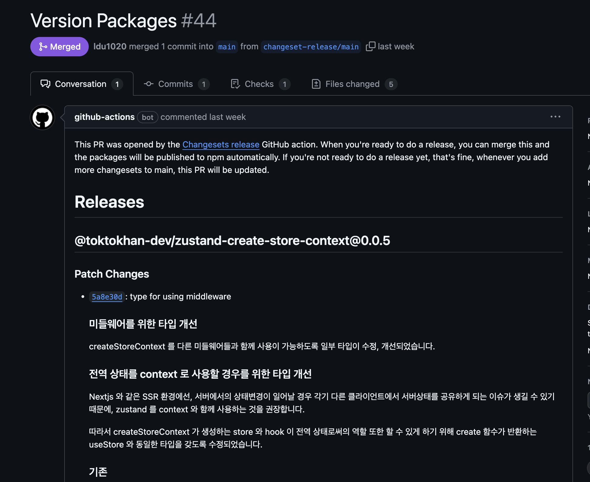 지금까지 하나의 패키지를 배포하는 과정을 설명드렸습니다. Changelog나 Release 같은 작업이 배포 과정에서 꼭 필요한 요소는 아닙니다. 하지만 누구나 사용할 수 있는 공개된 패키지라면, 사용자에게 버전 업데이트 내용을 문서로 전달하는 작업은 필수적이라고 생각합니다. 게다가 로그가 쌓이면 개발자 입장에서 관리도 훨씬 편리해지죠.