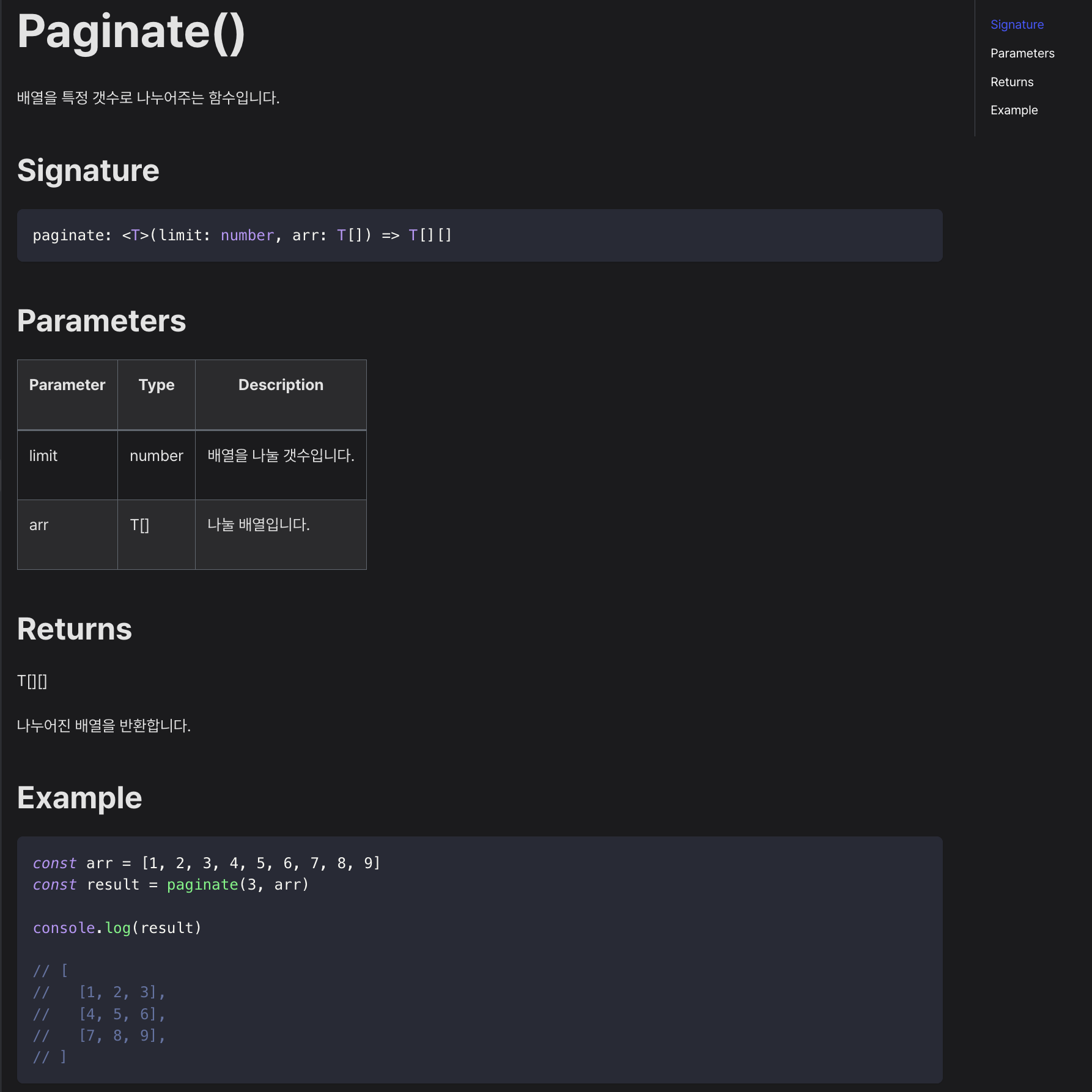 TS Doc 규칙에 맞게 잘 작성된 주석과, 올바르게 타입 된 함수만 있다면 명령어 하나만으로 우측의 md파일이 생성됩니다.