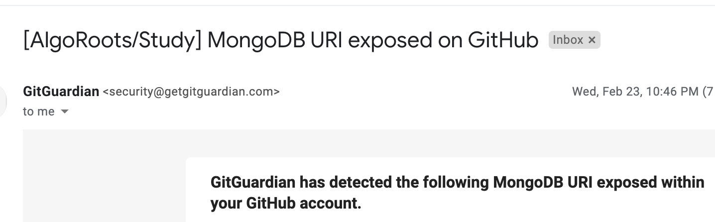 평소처럼 공부한 내용을 github에 푸시하고 난 뒤에 메일 하나가 왔다. 내 mongo DB URL 이 노출되었다는 메일이었다.