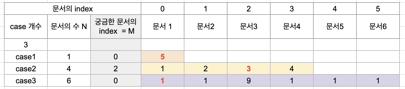 그렇게 우선순위를 출력한 결과에서 이전에 testcases에서 case별로 정해진 문서(M)가 몇 번째로 인쇄되는지 출력하면 되는 문제였다.