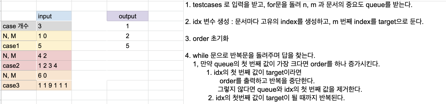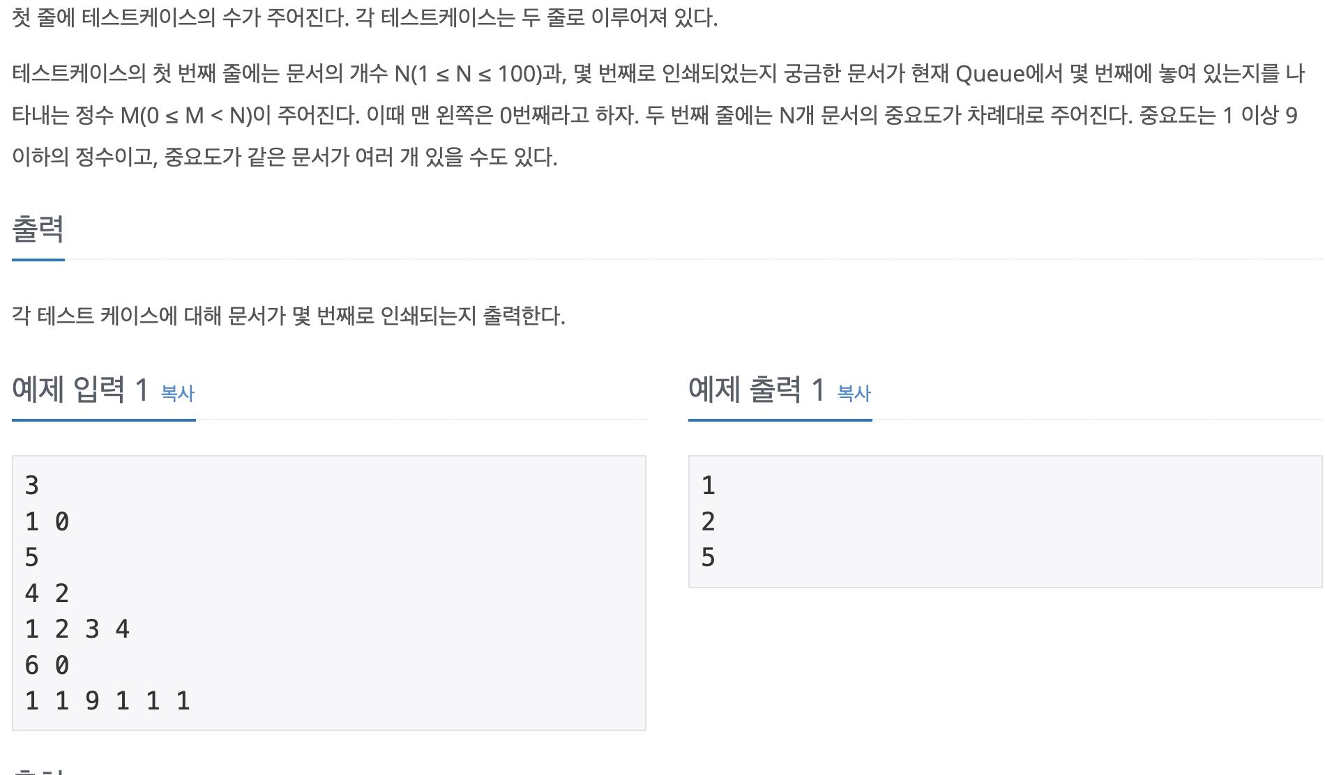 # 1. testcases 로 입력을 받고, for 문을 돌려 n, m 과 문서의 중요도 queue 를 받는다.