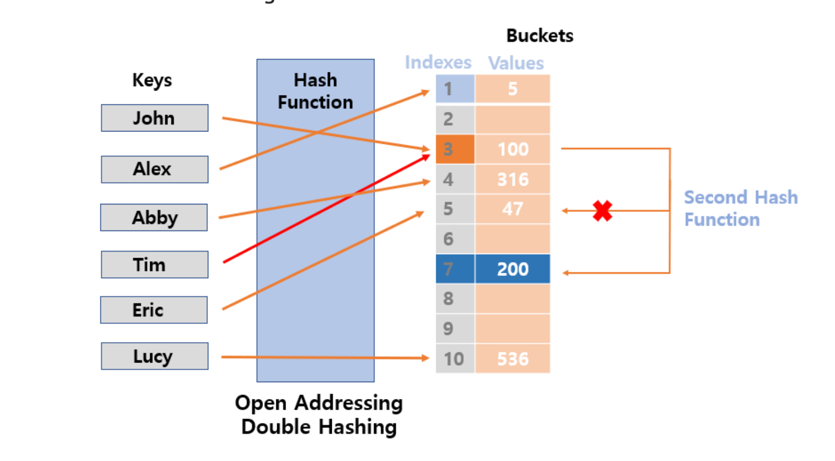 해시 테이블은 해시 1개와 값 1개가 일치하는 형식으로 유지된다. 버킷에서 충돌이 발생하면 index(해시가 변경되어 다른 버킷에 저장된다.