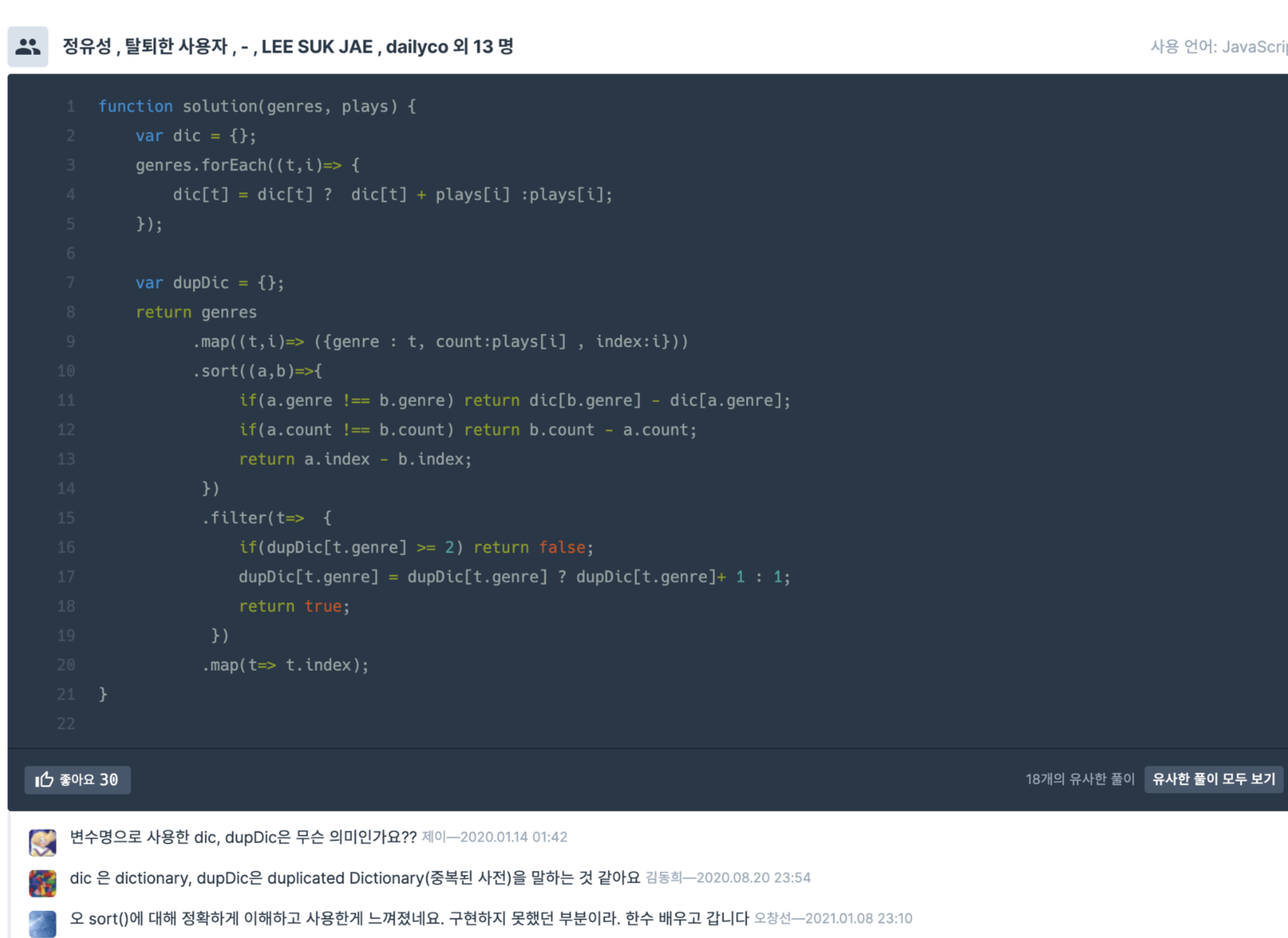 return에 하나씩 쌓여가는 배열메서드를 보면 볼수록 소름이돋는다.. 프로그래머스는 저렇게 추천순으로 풀이를 볼 수 있어 좋은 것 같다.