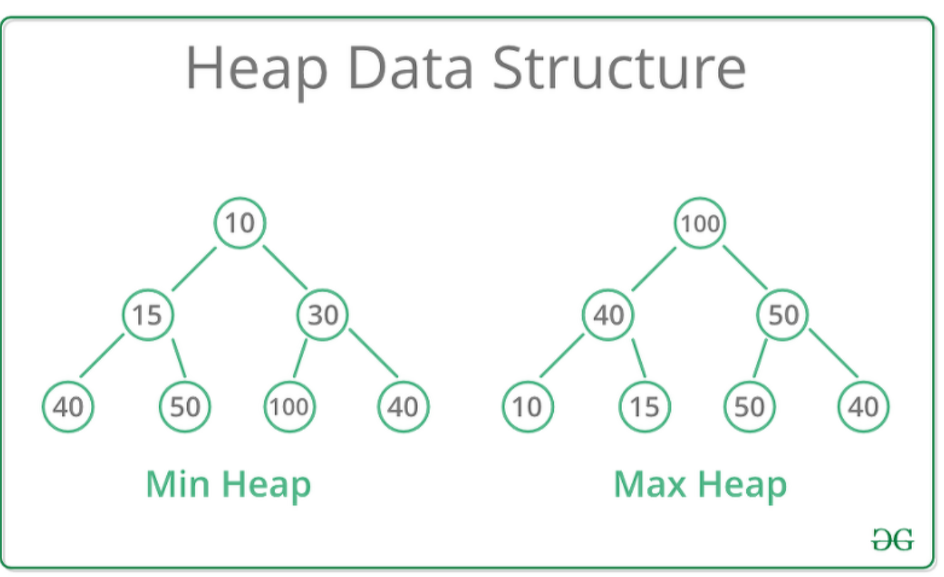 위 이미지에서 Min Heap은 [10, 15, 30, 40, 50, 100, 40], Max Heap = [100, 40, 50, 10, 15, 50, 40 ] 이 된다.