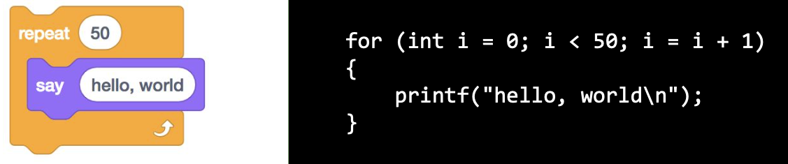 스크래치에서 블록으로 표현했던 조건문과 루프 또한 C로 동일하게 구현할 수 있습니다. 스크래치에서 여러 기능을 가진 블록들을 이어 붙였던 것처럼 C의 다양한 문법을 이용하면 조건문과 루프를 더 간단한 텍스트 형식으로 표현할 수 있습니다.