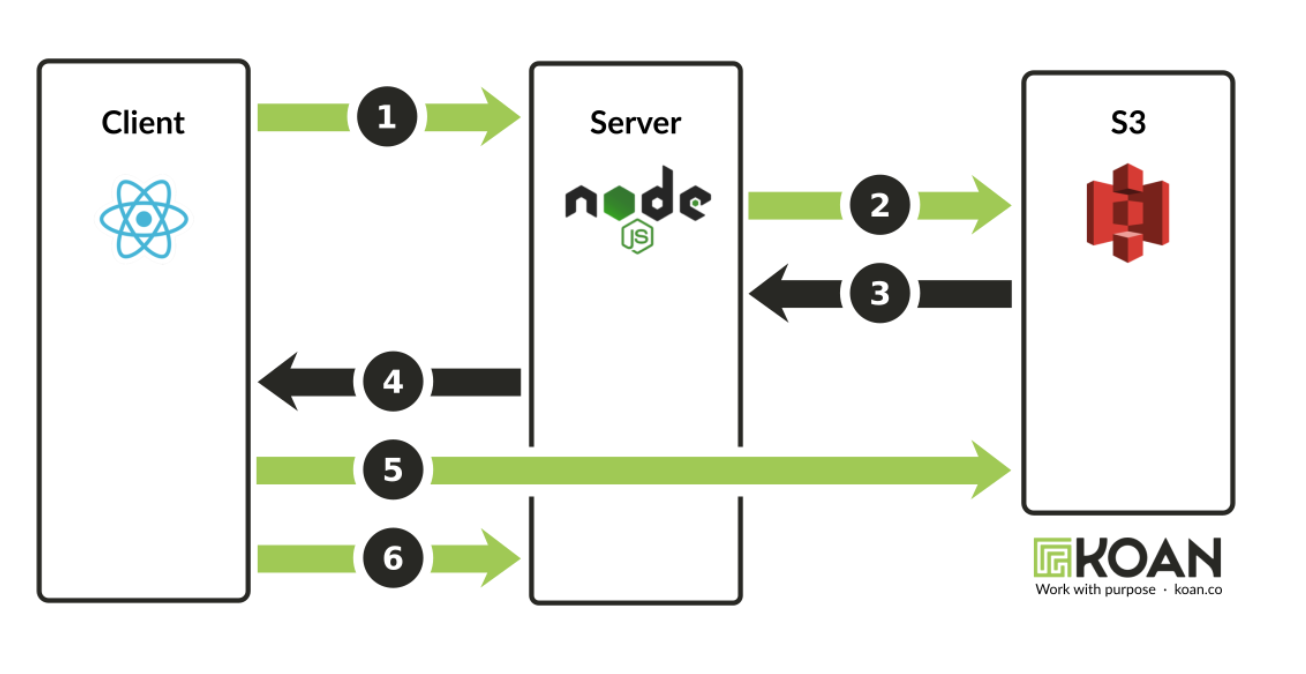 2번의 방법은 API서버에서 파일을 업로드하기 때문에 AWS Access Key와 Secret Key 정보를 서버가 가지고 있어 Key 정보가 노출되는 위험은 없다. 이때 파일을 업로드하면 파일 전달 흐름이 브라우저 -> 서버 -> S3 순으로 되게 되는데 이는 저장하지도 않을 파일들이 서버를 통해가면서 불필요한 서버의 리소스를 사용하게 된다. 또한 과도한 업로드 작업이 생기면 서버에 과부하가 걸리게 되고 서버를 한 번 거쳐가는 지연시간이 생기게 된다.